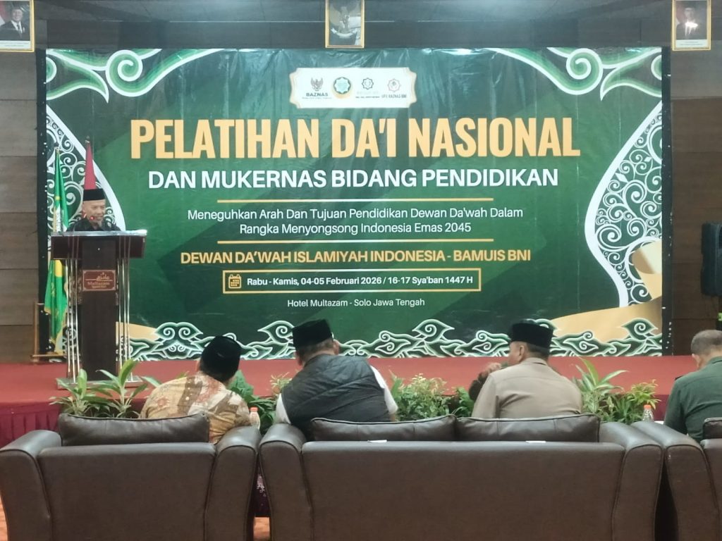 Dewandakwahjatim.com, Kartasura — Dewan Da’wah Islamiyah Indonesia secara resmi membuka Pelatihan Da’i Nasional dan Musyawarah Kerja Nasional (Mukernas) Bidang Pendidikan dengan mengusung tema “Meneguhkan Arah dan Tujuan Pendidikan Dewan Da’wah dalam Rangka Menyongsong Indonesia Emas 2045”. Kegiatan ini dilaksanakan selama dua hari, Rabu–Kamis, 4–5 Februari 2026, bertempat di Hotel Multazam, Jl. Garuda Mas No. 4B, Pabelan, Kartasura, Sukoharjo.