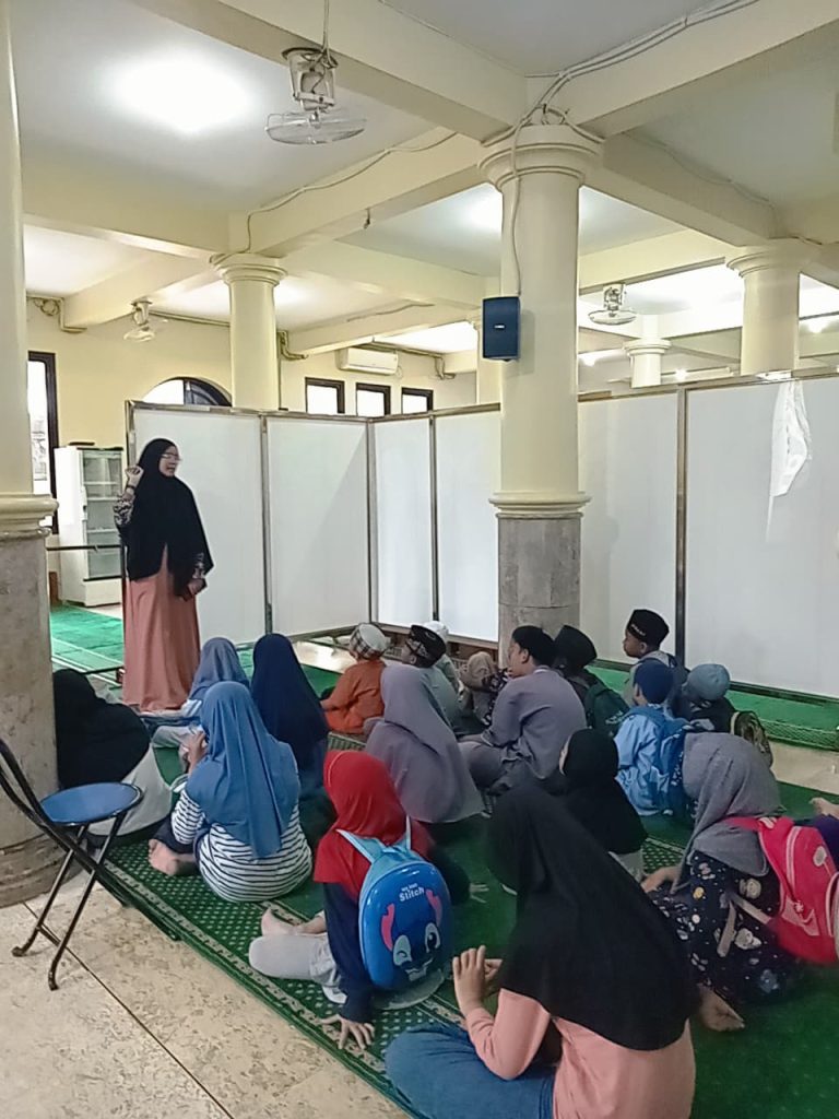 Dewandakwahjatim.com, Sidoarjo – Kegiatan berkisah ini diawali dengan berkumpulnya para murid TPQ Al Muhajirin Rewwin, Waru, Sidoarjo, di dalam masjid Al Muhajirin bersama guru TPQ dan mahasiswa ADI pada Selasa 10 Maret 2026. Suasana dibuat santai dan menyenangkan agar anak-anak dapat mendengarkan kisah dengan lebih fokus. Salah satu mahasiswa ADI, yaitu Rumna, kemudian memulai kegiatan dengan berkisah tentang perjalanan hidup Nabi Ibrahim AS.